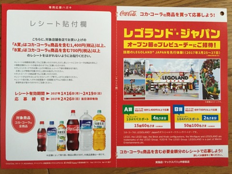 こちらコカ・コーラ社商品を含む必要金額分(A賞1,400円、B賞700円、それぞれ税込)以上のレシートを応募ハガキに貼って送ると応募ができるというもの。